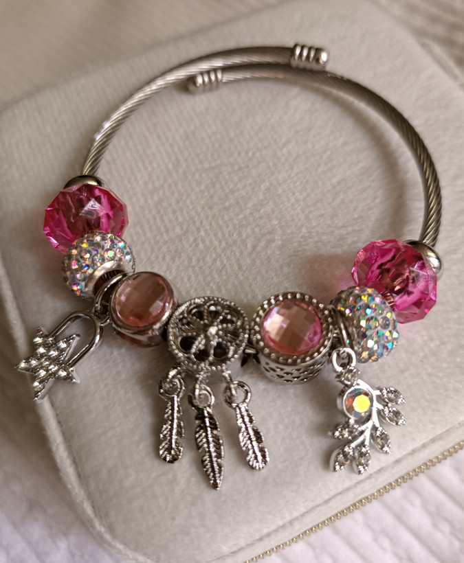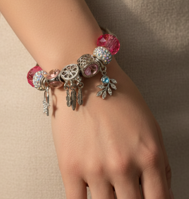 این دستبند با ترکیب مهرههای کریستالی صورتی، چارمهای نگیندار و نماد دریمکچر (کابوسگیر) طراحی شده است. بدنه مفتولی و منعطف آن، استفاده از آن را بسیار راحت کرده و جلوهای فانتزی و پر زرقوبرق به استایل شما میدهد