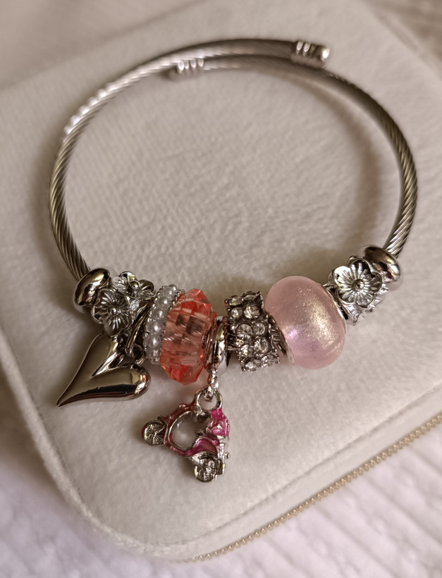 تزیینات: شامل آویز کالسکه میناکاری شده، قلب صیقلی، مهره شیشهای اپال (Opal Style) و ردیف نگینهای اتمی.